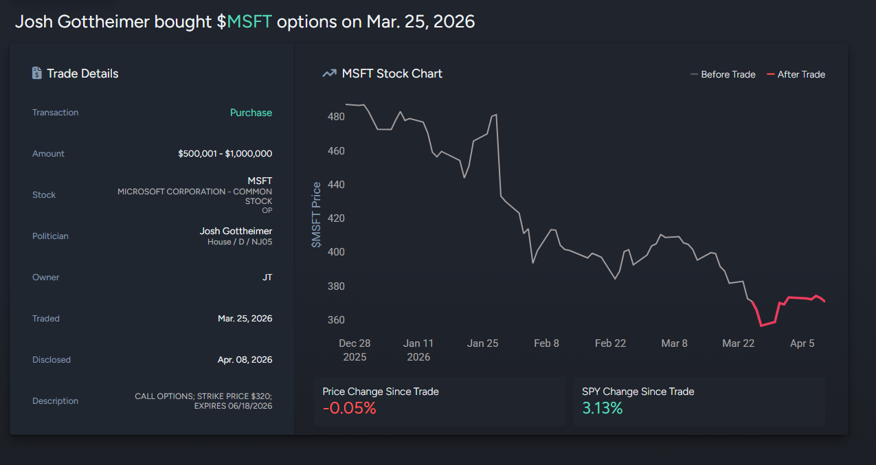 Rep. Josh Gottheimer disclosed up to $1M in $MSFT call options (June 2026)