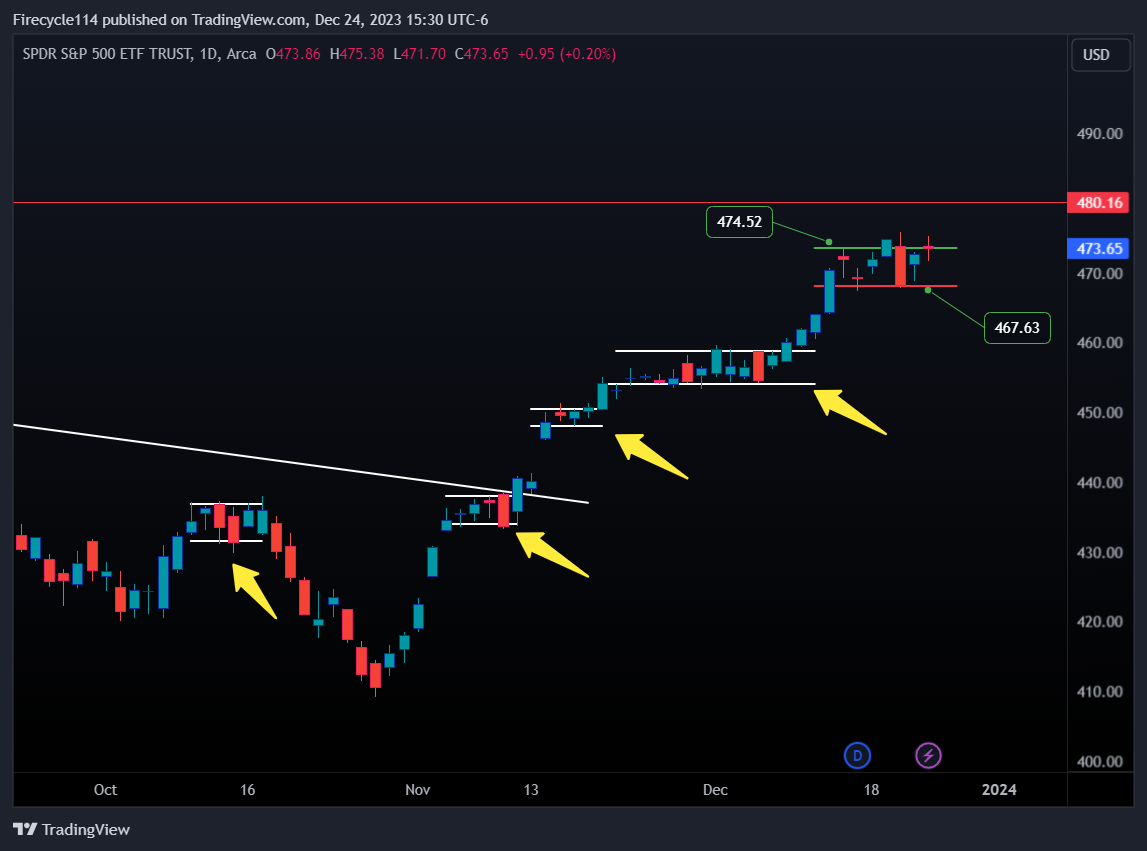 SPY 0.00%↑ is on a consolidation phase where we are trading sideways and cooling off from our last breakout to the upside. We have been trading sideways between $467 and $474. Depends upon which side it decides to breakout to so it is very important to stay neutral until we see the confirmation. Currently SPY 0.00%↑ is sitting at the resistance which is the roof of the channel. Above $474 price target $480 which is all time highs! The overall bias is bullish with Christmas and New Years and us finally hitting all time highs. Historically starting from Christmas to New Years eve that is the most bullish for the stock market which is called the Santa Claus rally.