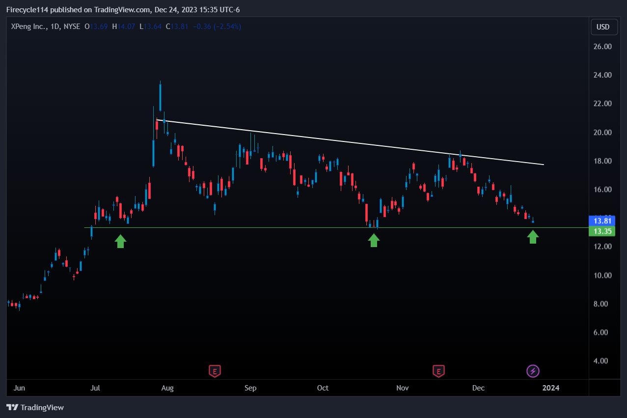 $13.35 is a critical level for XPEV 0.00%↑. I want to grab a swing for shares and call options 2-3 weeks out to play the bounce off the support. Stop loss the close below $13.35 on the daily timeframe.