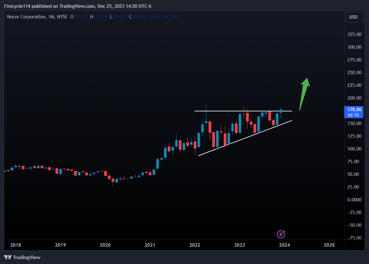 NUE 0.00%↑ has been consolidating since 2022 and it has now closed above on the monthly timeframe. This is a great play for leaps or long-term shares to ride the wave to the upside.