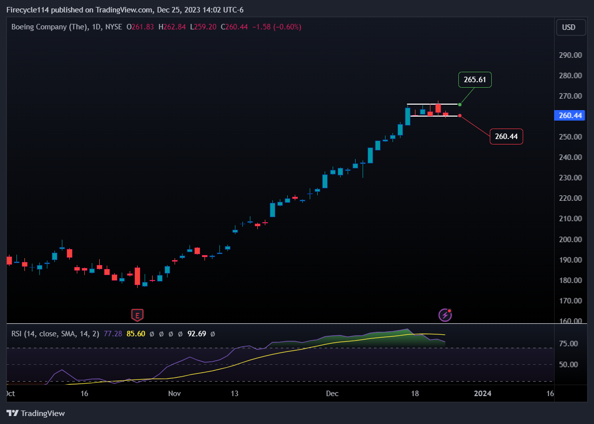 I am looking to short BA 0.00%↑ below $260. The RSI is well overbought and it had a incredible run for the past couple weeks. It is also sitting at a massive weekly resistance. Looking at a day trade for puts below $260 at market open.
