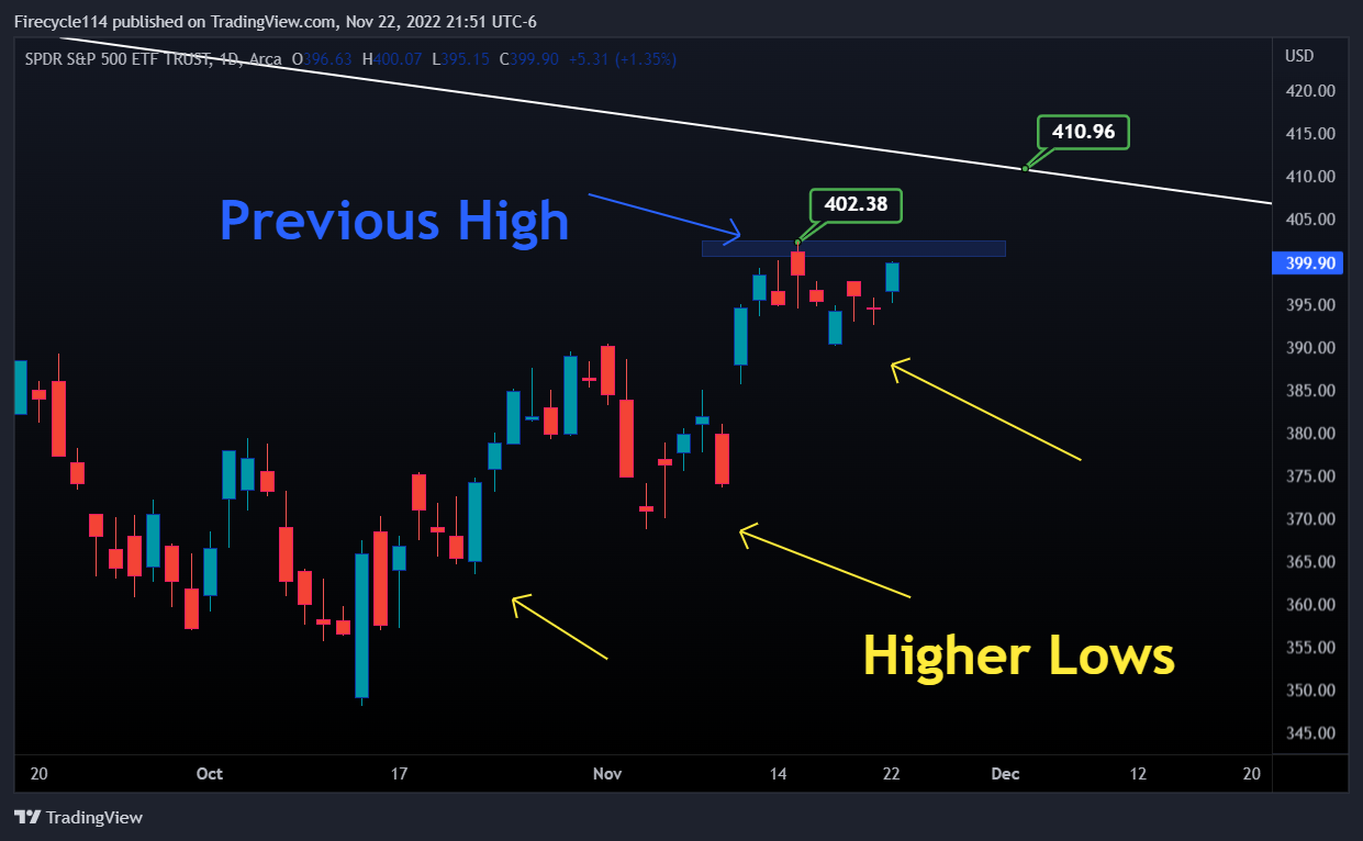 Taking a look at a closer picture on the daily timeframe (Chart 2). We are making higher lows which is good for the bulls. We are approaching 402.38 which is a resistance on the daily timeframe. Above 402.38 we have 410.96-412 as our resistance which is the white trend line that I went over on the Chart 1. It is really important that we hold and stay above the higher low which is @ 390 for the bulls.