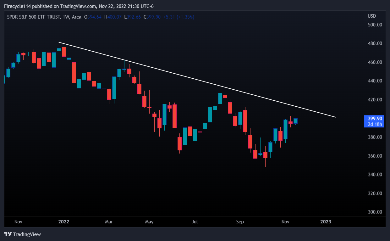 The S&P 500 has been falling dramatically for the past year and has had multiple rallies while dropping YTD. The past month the SPY has been up over 5%. Looking at the white trend line (drawn on Chart 1) 410 is a crucial level to watch for the bulls. Buyers have tested that level many times and have always rejected it.