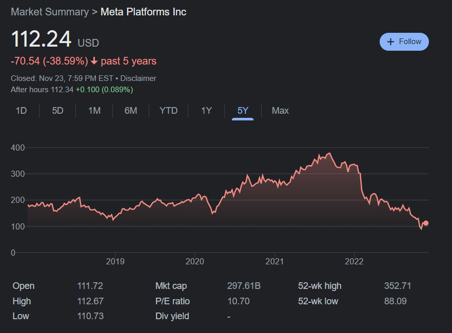 This is probably the biggest fire sale I have seen in the market as of right now and I would label this investment as a high risk, high reward stock pick. Meta platforms is sitting at 2015 levels. Dropping significantly because of its Metaverse endeavors, leaving the shareholders in a enigmatic future. A lot of uncertainty remains for the future of Meta Platforms.