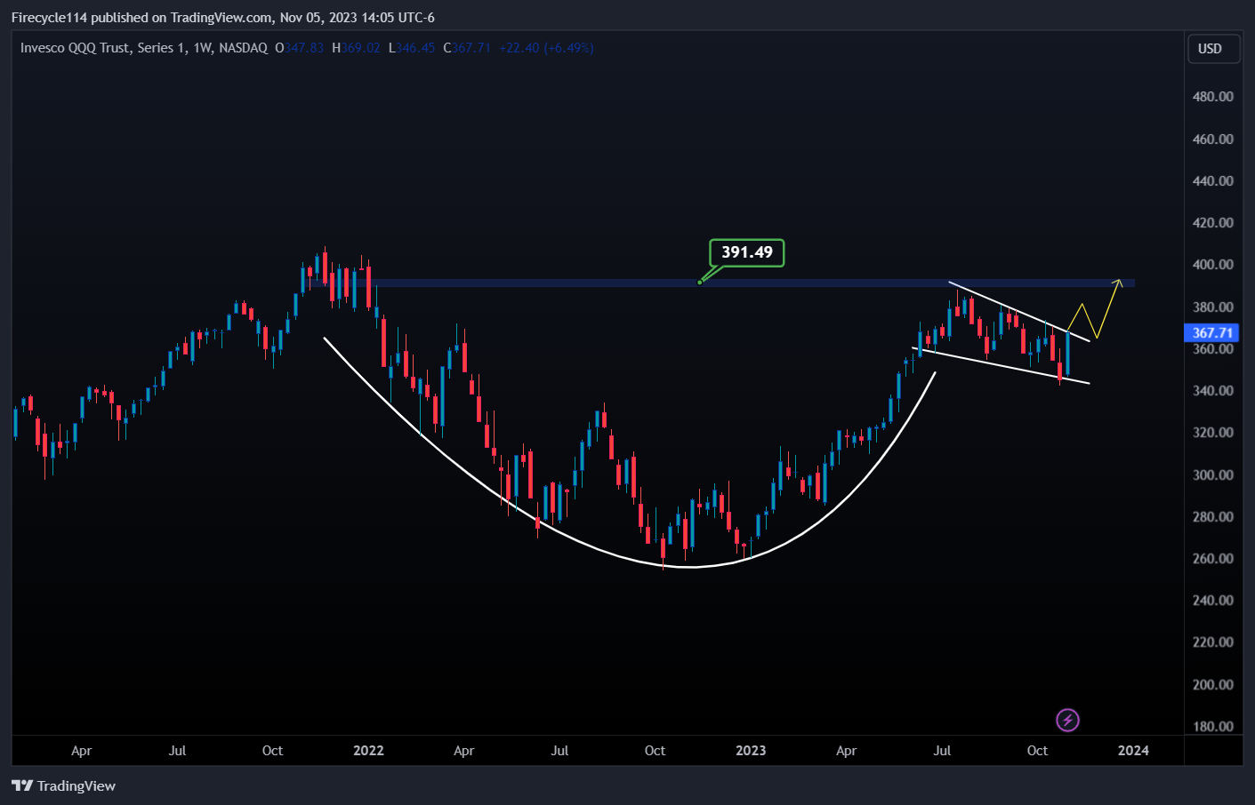 QQQ 0.00%↑ breaking downtrend + a cup handle breakout is extremally bullish on the weekly timeframe. Tech is looking amazing.