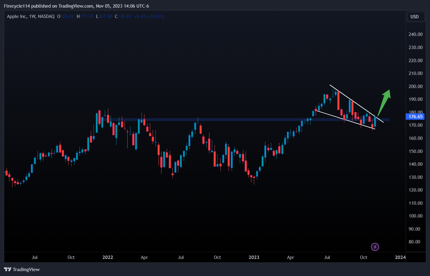 AAPL 0.00%↑ falling wedge breakout on the daily and weekly timeframe. This is going to be a play on call options with 1-2 months out expiration. The chart is looking absolutely perfect with a solid A+ setup. a close above 178 is going to push us to 200+ through the Holidays. Great option play for the Holidays!