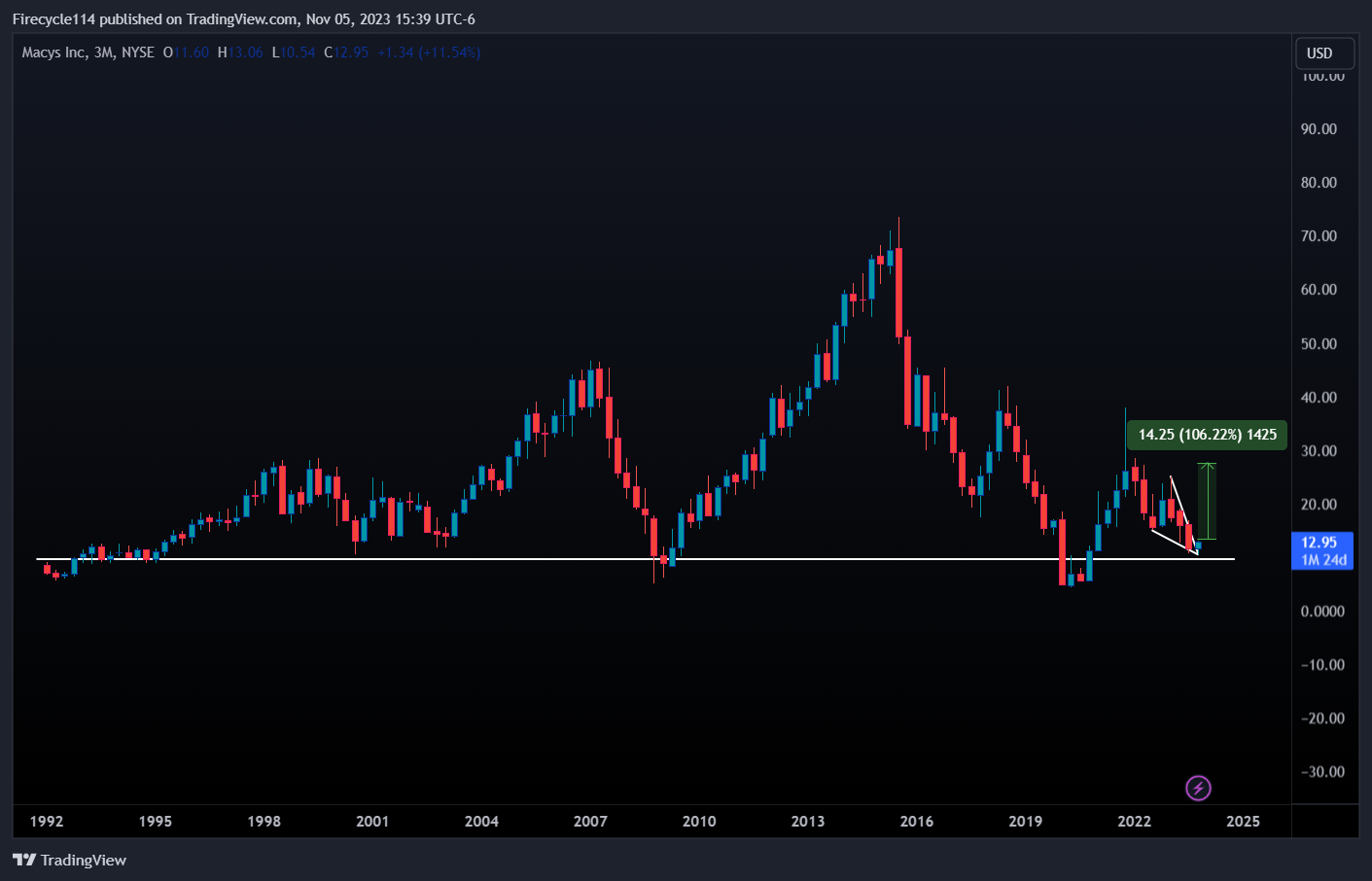 M 0.00%↑ is a incredible one since we have the Holidays coming up. We are sitting at a 3-decade low since 1992. Historically this is the best opportunity to buy into Macy’s. We can expect high consumer confidence for retail stores like Macy’s because of the Holidays. On the weekly and daily timeframe we have a falling wedge setup. A close above $13 on the daily/weekly timeframe is going to psychologically show us that we have broken the trend to the upside. The risk to reward is amazing with the stock sitting under $13 making it a great play for small accounts that do not want to risk on options. The upside potential is +106%. I will be looking to sell-off my position around New Year’s time.