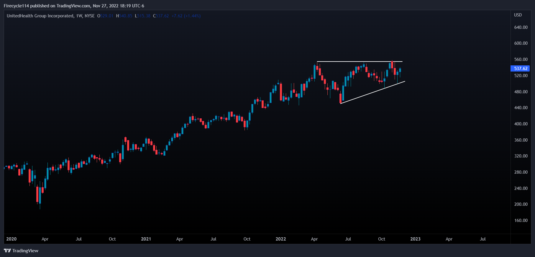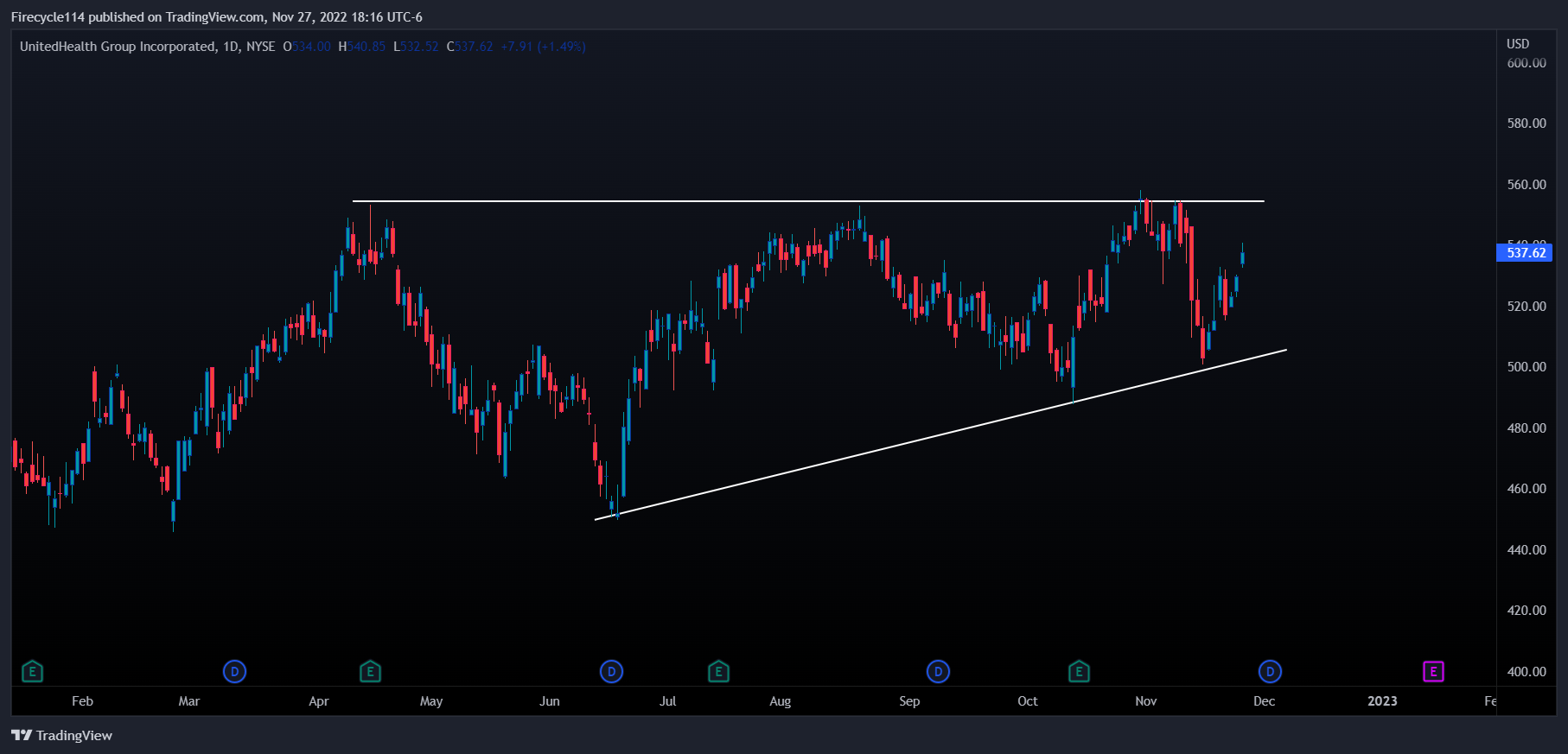 Pfizer on the daily timeframe zoomed in looks a lot more interesting. We have a ascending triangle formation with a support and resistance + a wick acting as our entry, stop loss and price target. Looking to play calls at open, price target $50+ for a day trade.