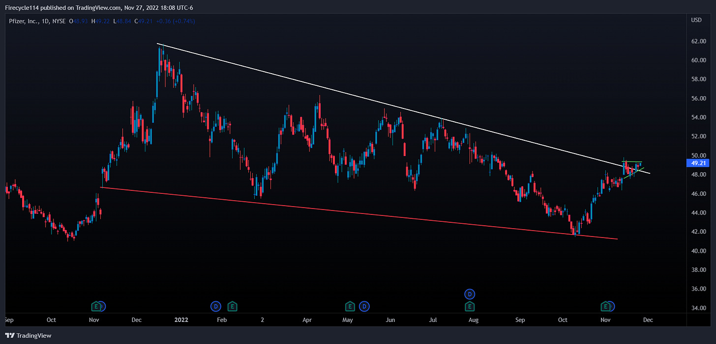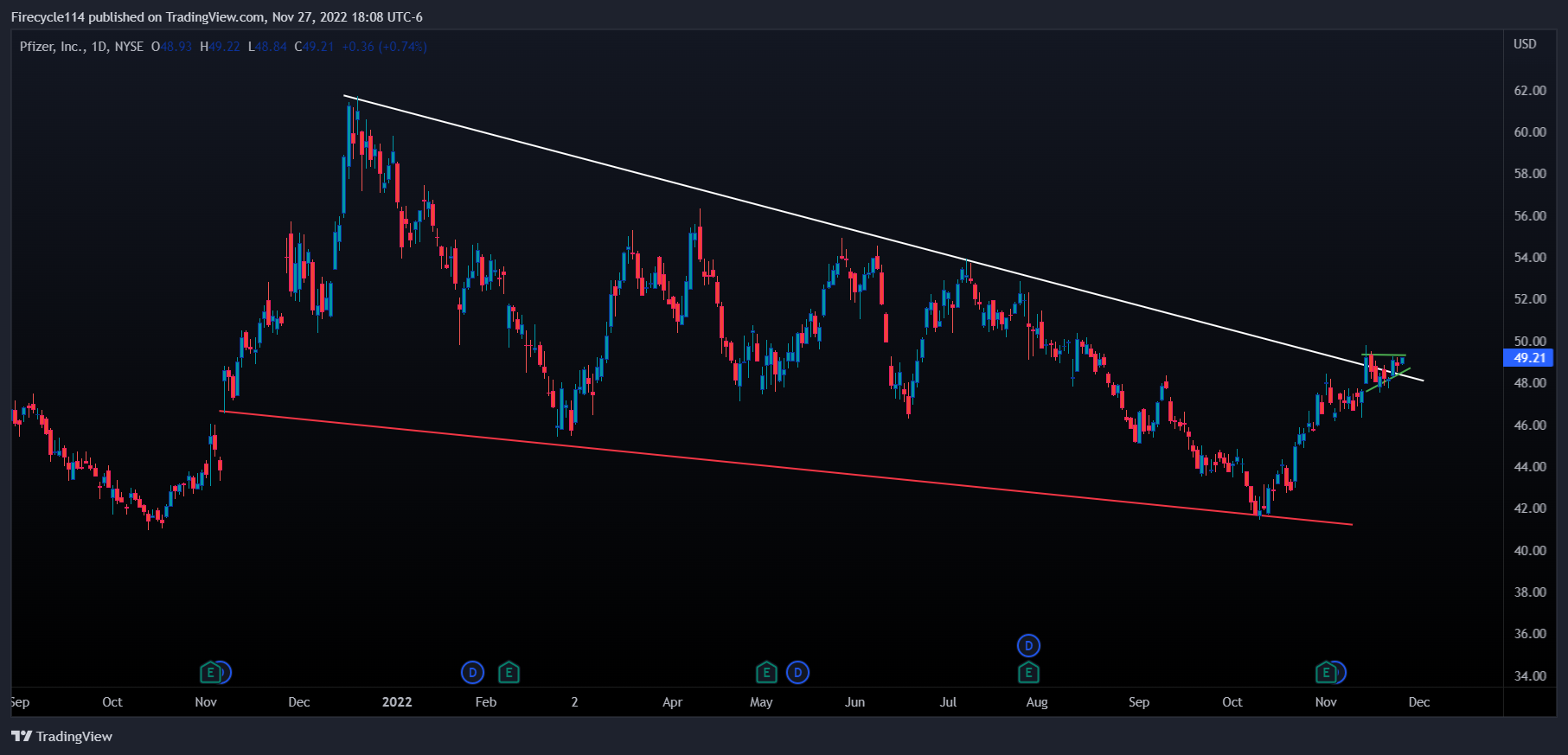 Pfizer on the daily timeframe is breaking the downtrend and has in fact closed above a major level of resistance even on the weekly timeframe. We are breaking a major downtrend on the daily and weekly timeframe.