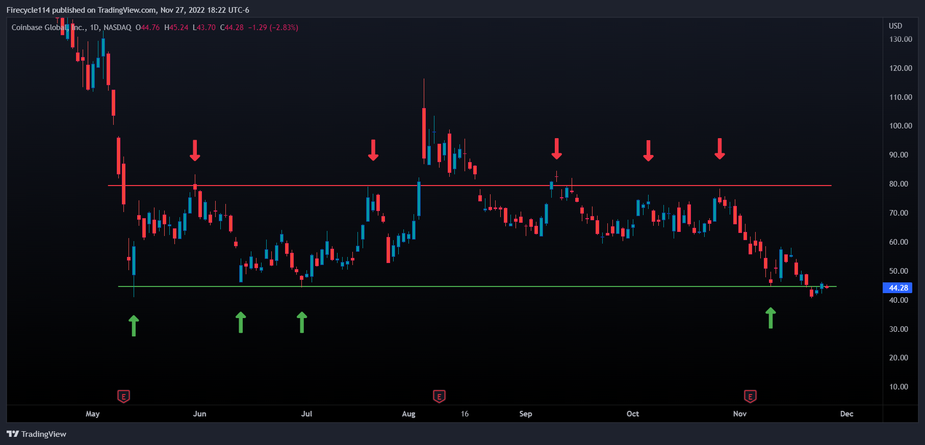 We have talked about COIN 0.00%↑ in another article . It is sitting around the level of support which is a critical level of support. We can play calls here for a swing and have a stop loss below 44 on the weekly candle close. Or we can play puts if it starts breaking the 44 level.